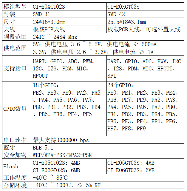 针对不同的应用需求,启英泰伦基于CI230X芯片推出了2款公版模组,型号分别是:CI-E0XGT02S和CI-E0XGT03S。主要参数说明下:
