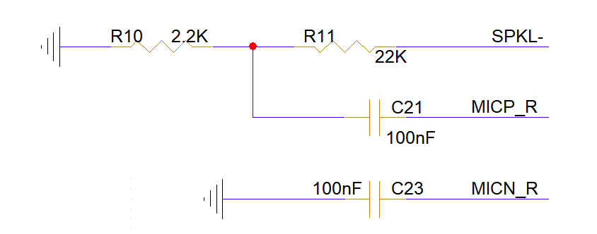 AEC电路主要作用是将喇叭输出的信号分压回采至芯片。本设计中回采信号可以接喇叭输出SPK+或者SPK-,然后再输入至芯片麦克风右声道的正极。