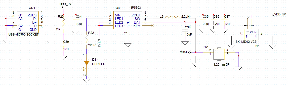 供电主要为电池充电管理部分和升压部分。可以采用分离的充电芯片和升压芯片。本设计采用了IP5303芯片,可进行电池充电且输出5V为系统供电。如上图。