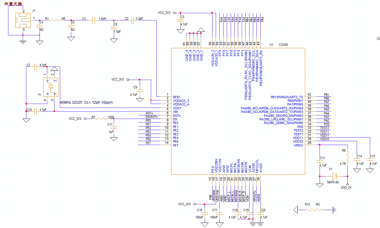 需要注意的是,VIN5V为语音部分供电,VDDA33为WiFi部分供电,两者完全独立,有效降低了相互干扰的风险。因此芯片需要供3.3V和5V两路电源。