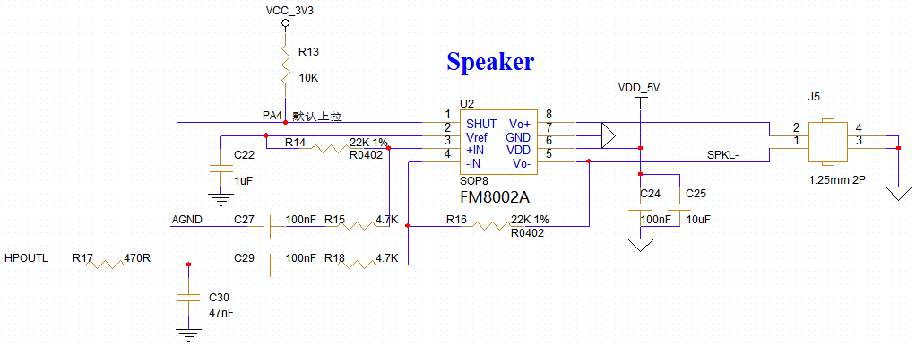 功放电路尤为重要,处理不好容易导致异响或其他杂音。本设计使用AB类功放FM8002A,推荐将主芯片AGND和HPOUT信号以差分的形式接至功放,同时功放的Bypass电容接AGND。可有效避免系统干扰导致的杂音。同时,也可选用能防RF干扰的功放芯片。
