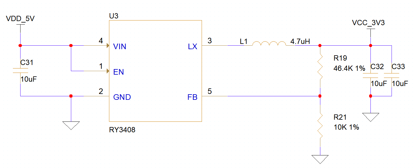DC-DC主要将升压后的5V降压至3.3V为芯片WiFi部分供电,要求纹波低,电流大于1A。本设计采用的是RY3408芯片。如上图。