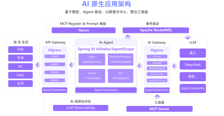 涵盖了AI 原生应用的 11 大关键要素,模型、框架、提示词、RAG、记忆、工具、网关、运行时、可观测、评估和安全。