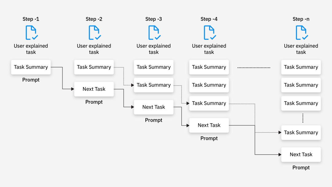 在有提示词路由的前提下,复杂问题可以通过提示链(Prompt Chaining)进行系统化拆解。提示链允许将一个大任务拆分为多个子任务, 每个子任务对应不同的提示词或模型调用,最后将结果整合。这种方式比较适合于有固定的流程,并且有一些步骤是可以跳过的。