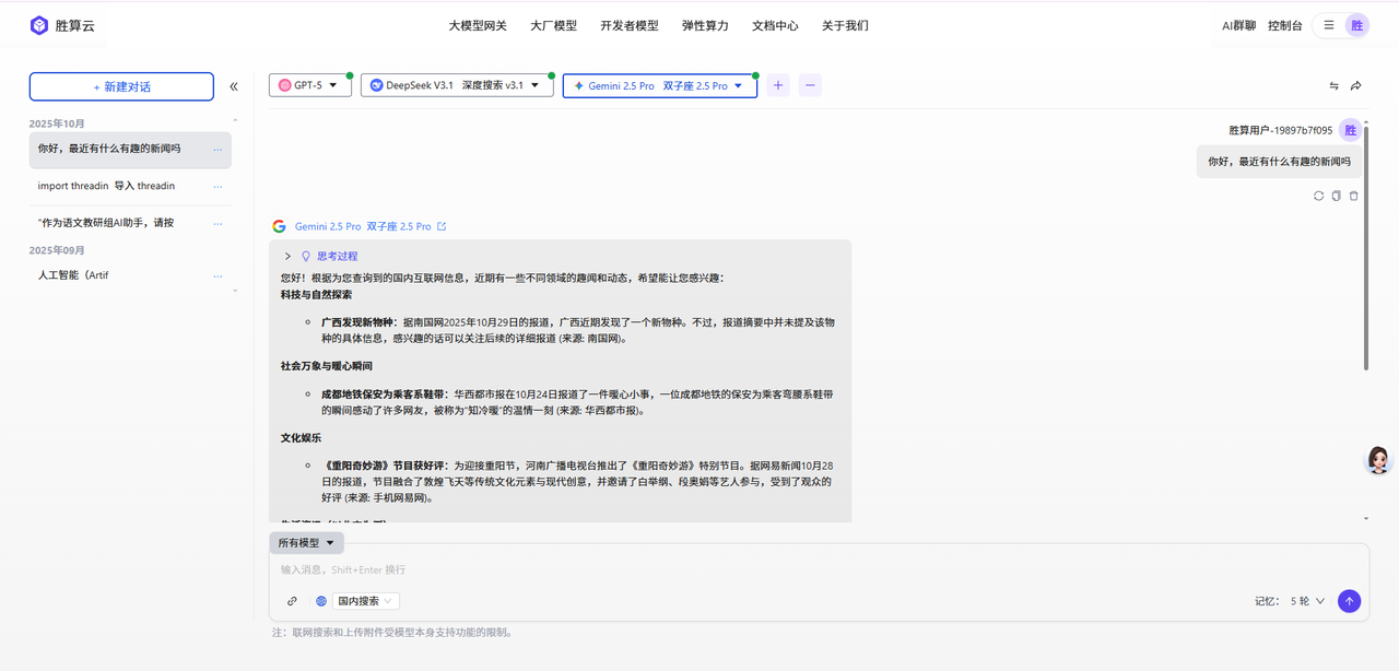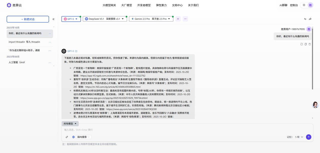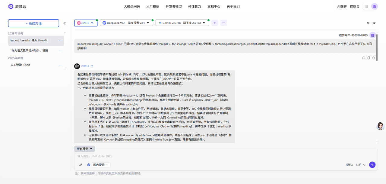 胜算云AI群聊工具支持同时接入GPT、Claude、Gemini等多个AI模型进行对比问答。用户注册后,可在群聊界面添加多个模型,输入问题即可获得不同AI的并列回复,便于分析差异。该工具支持文件上传、联网搜索等功能,适用于技术问题求解、文案创作、文献分析等场景,通过多模型协同提供更全面的解答方案。典型应用包括代码调试、时事分析等,有效提升工作效率。