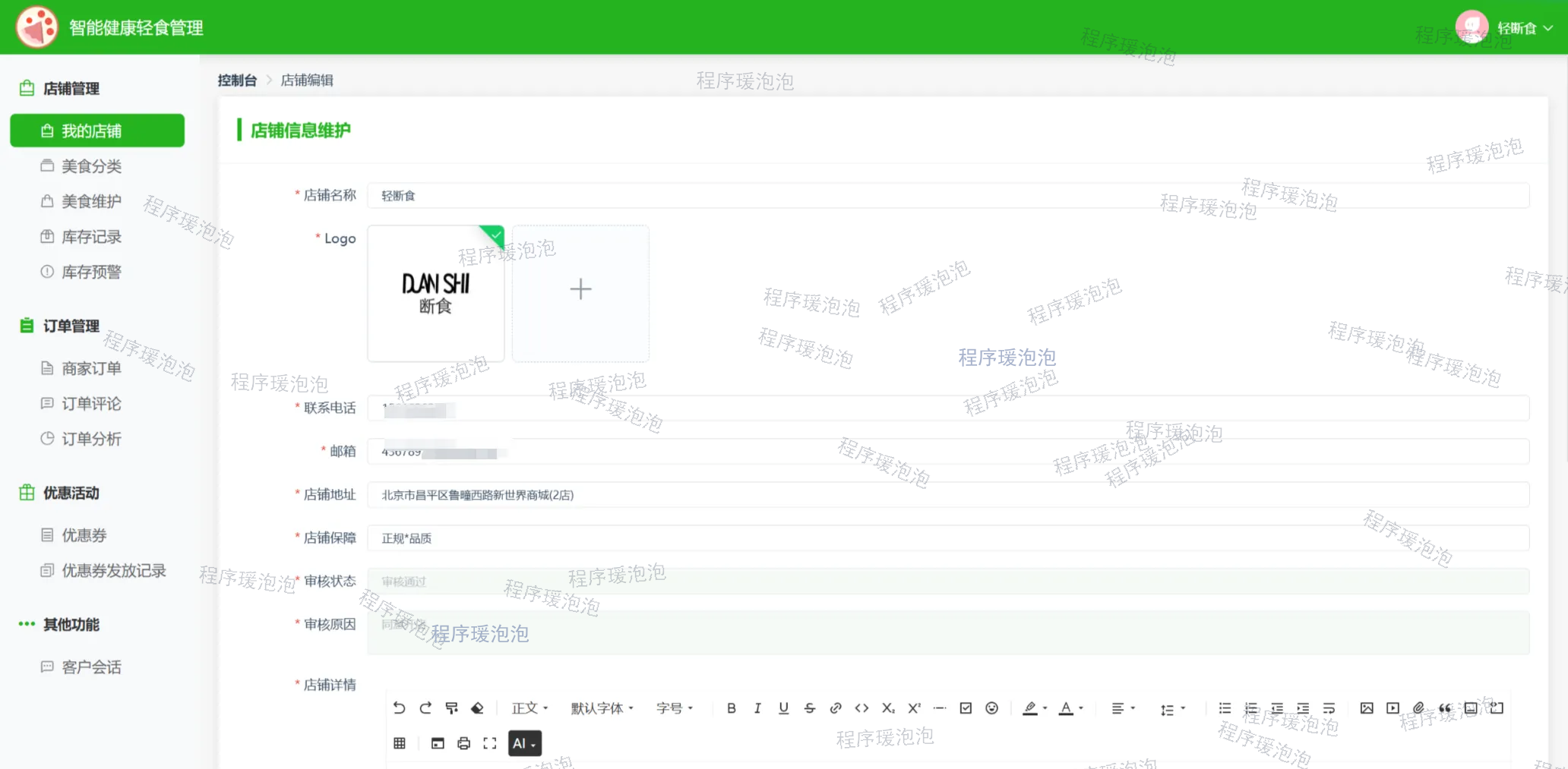 美食维护功能,前端跳转/Admin/GoodList界面维护店铺的餐品信息,可通过名称Input框进行调用/Good/List接口,后端通过模糊查询搜索美食信息,将数据以Json格式返回给前端,前端通过PaginationTable组件展示美食列表。管理店铺售卖的餐品,调用/Good/CreateOrEdit进行新增餐品。当商家决定不再售卖当前商品,可以进行删除商品,调用/Good/Delete进行删除商品,删除商品后前端会重新刷新界面。当商品需要修改时,选择一条商品信息前端就会弹出修改的窗口,然后进行调用/Good/Get方法进行获取餐品的初始数据,商家结合情况并根据需求进行修改餐品,进行调用/Good/CreateOrEdit进行修改。同时商家可以导出商品信息并生成excel表,便于对店铺内容进行备份处理。