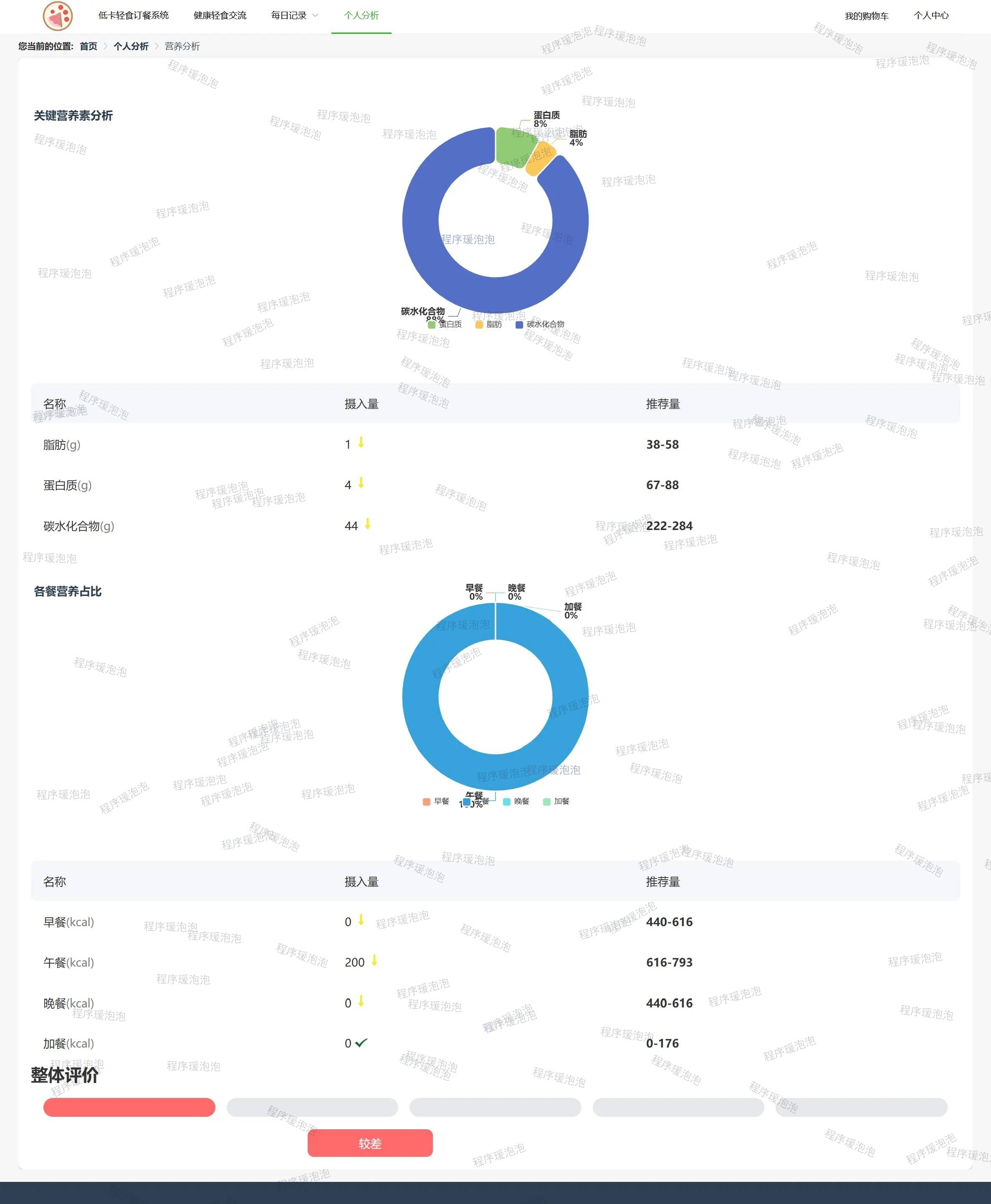 查看个人分析模块,前端跳转/Front/PersonAnalyse界面。该模块使用el-calendar组件展示日历。可以自动为用户提供精准、合理的营养摄入与能量消耗分析。调用/Archives/GetUserData接口展示显示饮食摄入的总热量UserData.TotalIncalorie,运动消耗显示的总热量UserData.TotalOutcalorie,并使用使用el-progress组件展示碳水化合物、蛋白质、脂肪的摄入百分比和摄入量与推荐量的对比。运用特定公式计算基础代谢率,汇总用户当日记录的运动产生的总消耗热量(totalOutcalorie)以及记录饮食的总摄入热量(totalIncalorie),通过公式Tdee + totalOutcalorie - totalIncalorie,计算出用户当日还可摄入的热量值。在营养成分分析层面,模块按照科学比例针对碳水化合物、蛋白质、脂肪三大营养素分别计算推荐摄入量。具体公式为(Tdee*对应比例) /对应每克热量,其中比例与每克热量依据营养学标准设定。