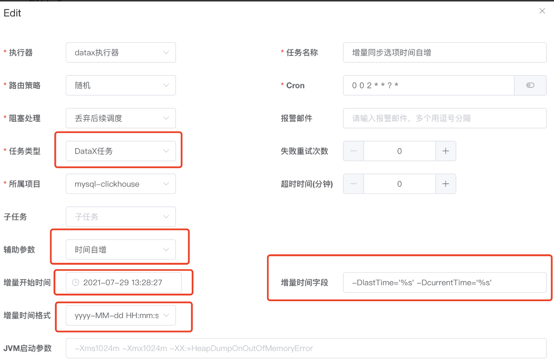 1.此处的关键点在${lastTime},${currentTime},${}是DataX动态参数的固定格式,lastTime,currentTime就是我们页面配置中 -DlastTime='%s' -DcurrentTime='%s'中的lastTime,currentTime,注意字段一定要一致。