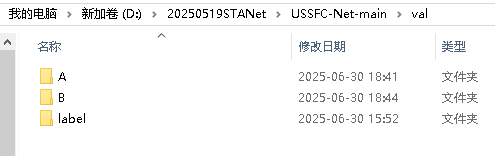 1.STANet网络层有自己的变化分析数据集格式要求,如下图,需要训练train、验证val和测试test三个数据集包。位置随意放,等训练的时候修改代码路径即可。