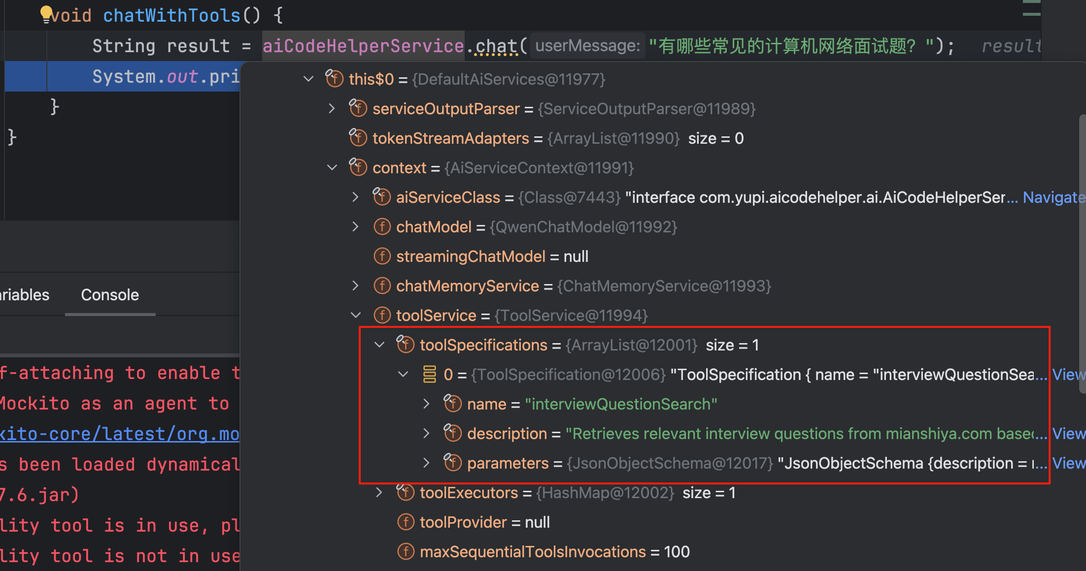 调用 AiServices.create 方法就可以创建出 AI Service 的实现类了,背后的原理是利用 Java 反射机制创建了一个实现接口的代理对象,代理对象负责输入和输出的转换,比如把 String 类型的用户消息参数转为 UserMessage 类型并调用 ChatModel,再将 AI 返回的 AiMessage 类型转换为 String 类型作为返回值。