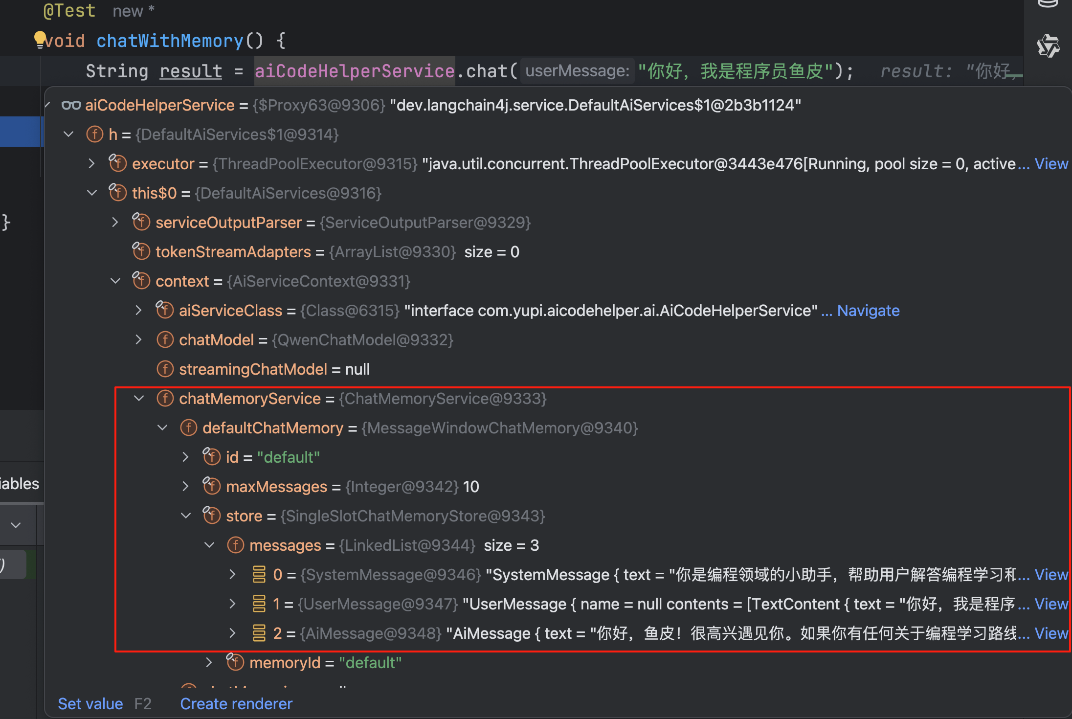 然后创建一个编程助手 AI Service 服务,采用声明式开发方法,编写一个对话方法,然后可以直接通过 @SystemMessage 注解定义系统提示词。