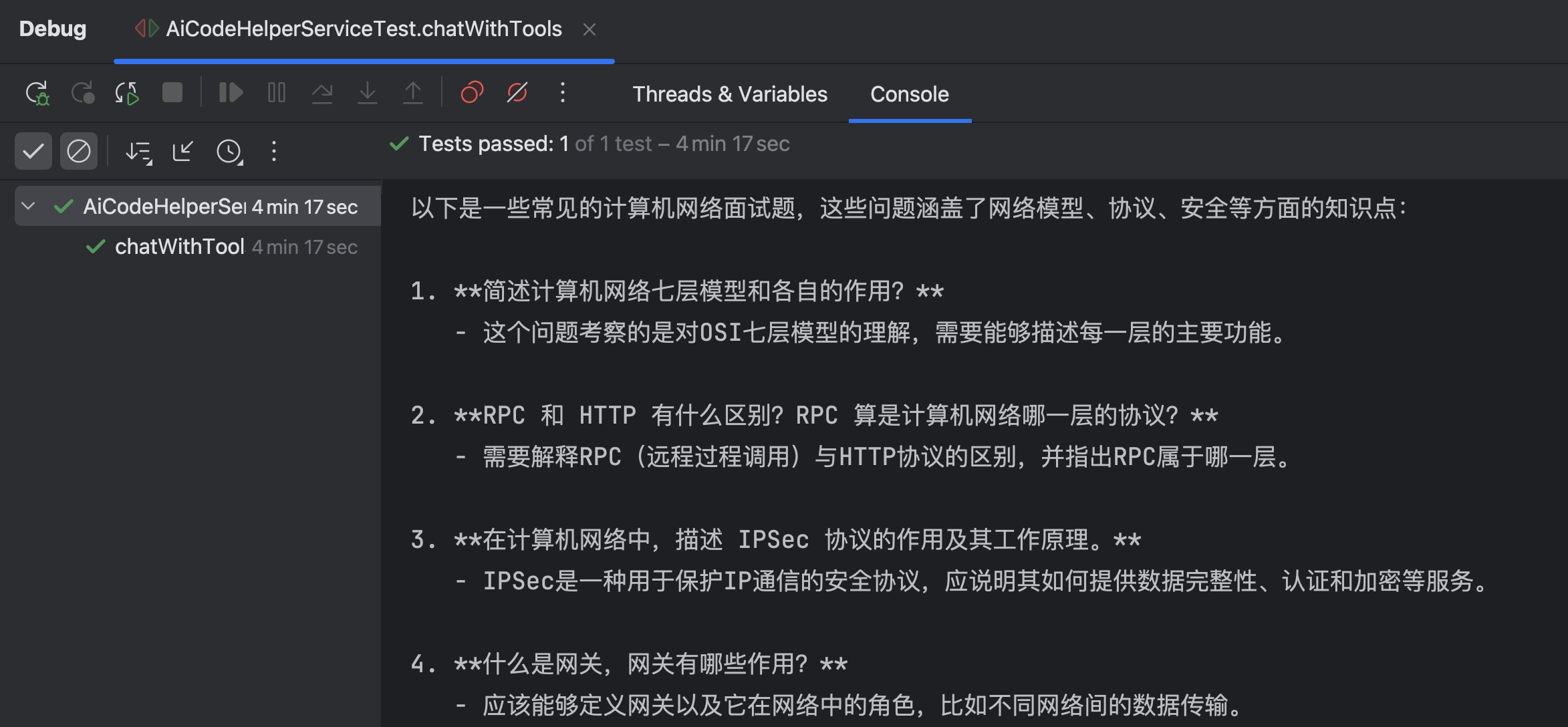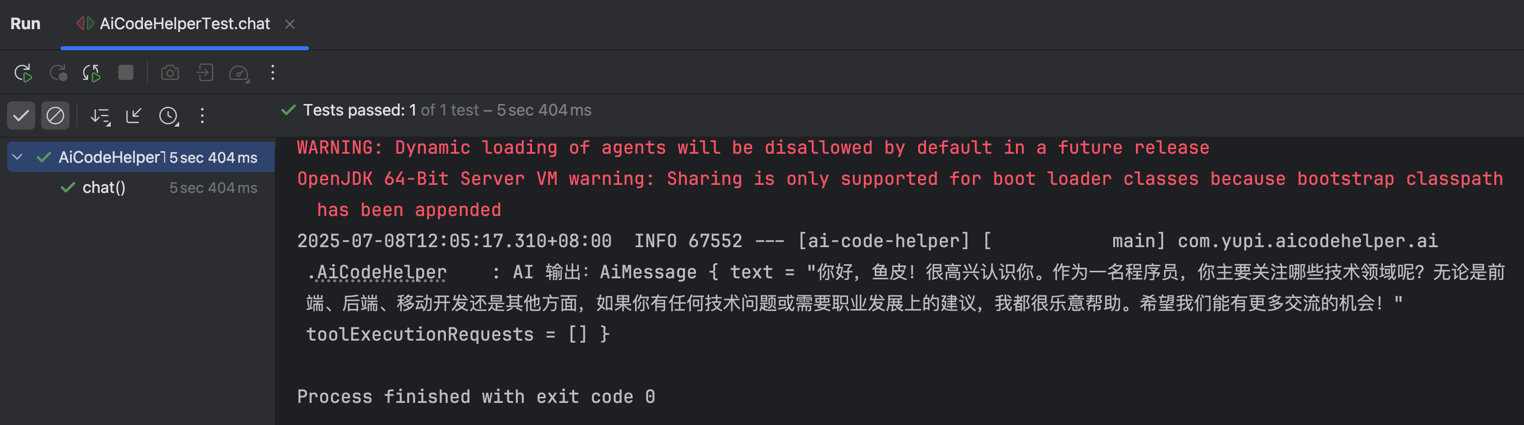 再次运行单元测试和 AI 对话,显然系统预设生效了: