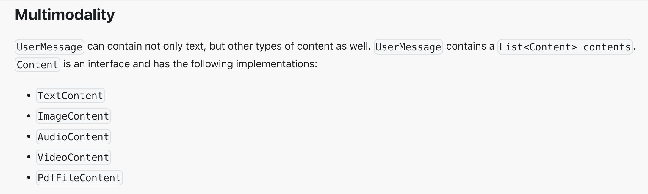 LangChain4j 中使用多模态的方法很简单,用户消息中是可以添加图片、音视频、PDF 等媒体资源的。