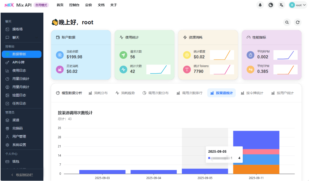 企业场景中“单账号多成员共享”的核心需求,可通过MIXAPI的“令牌管理”功能实现,对应源码在 controller/token.go 与 model/token.go ,支持“额度限制”“IP白名单”“模型权限”三大控制维度。后台“数据看板”模块提供“总请求数”“成功率”“额度消耗”等核心指标,对应源码 controller/statistics.go ,支持按日期、令牌、模型分组查看,便于快速