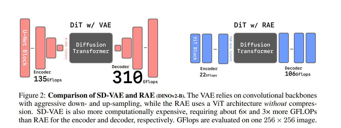 作为2021年推出的技术,SD-VAE采用的骨干网络早已跟不上Transformer时代的节奏。实测数据显示,SD-VAE完成一次图像编码需消耗约450 GFLOPs的运算量,而基于标准化ViT架构的简易编码器(如ViT-B)仅需22 GFLOPs即可达成同等目标,算力成本相差20倍以上。在大模型参数持续扩张的当下,这种低效架构已成为性能提升的严重桎梏。