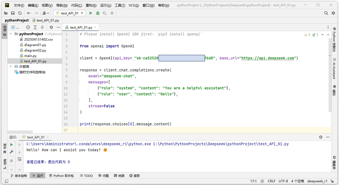 图2-3:调用DeepSeek API例程的运行结果