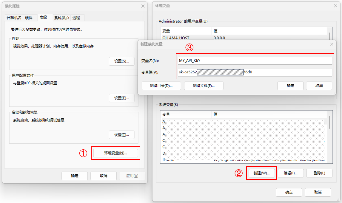 3. 在新建系统变量窗口中,“变量名”填入MY_API_KEY,“变量值”填入用户创建的API Key,如图2-4所示。点击“确定”按钮关闭系统属性配置页面,完成环境变量配置。