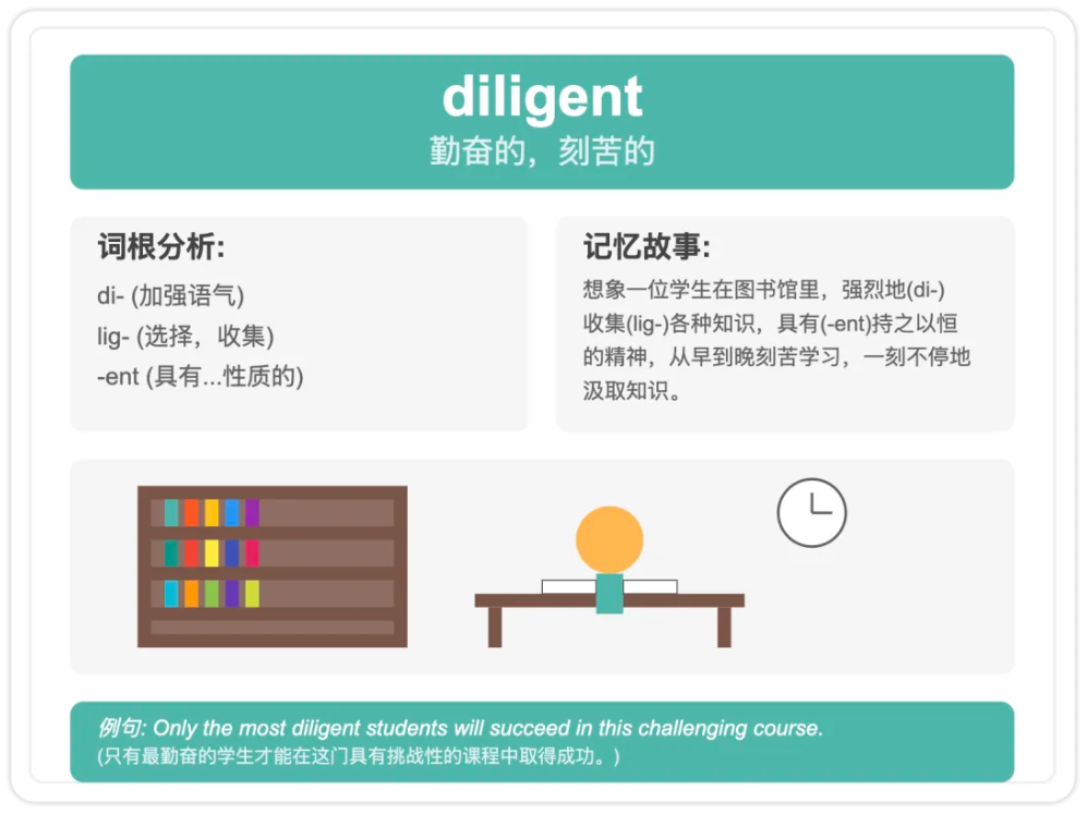 diligent想象一位学生在图书馆里,强烈地(di-)收集(lig-)各种知识,具有(-ent)持之以恒的精神,从早到晚刻苦学习,一刻不停地汲取知识。
