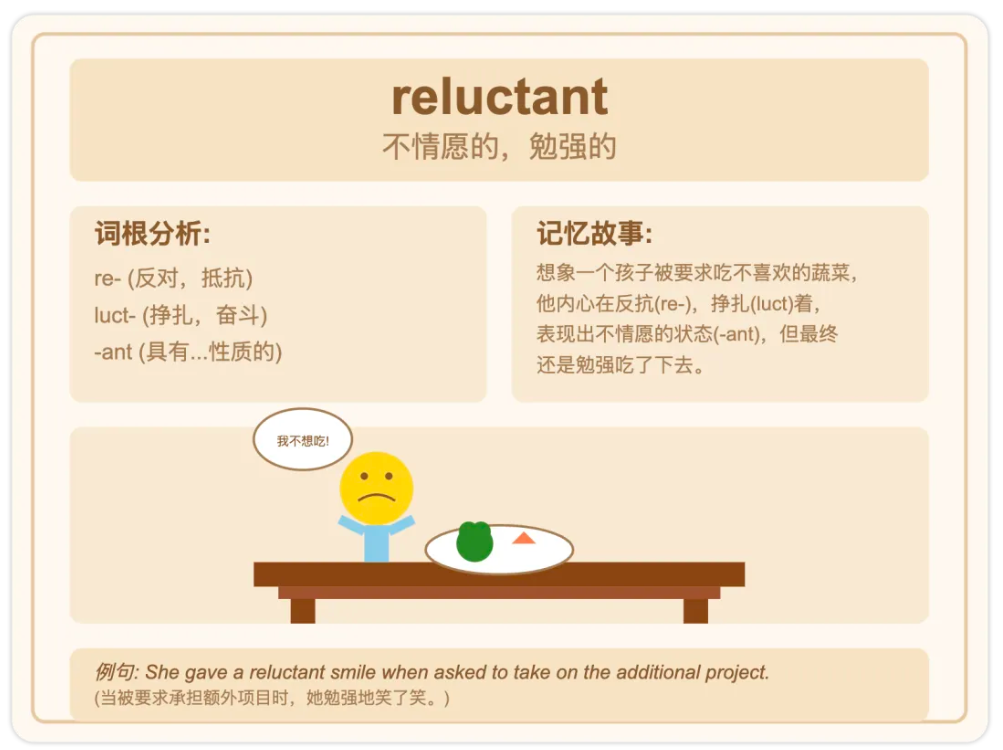 reluctant想象一个人被要求做一件不想做的事,他内心在反抗(re-),挣扎(luct)着,表现出不情愿的状态(-ant)。就像一个孩子被要求吃不喜欢的蔬菜,内心充满抵抗,但最终还是勉强吃了下去。