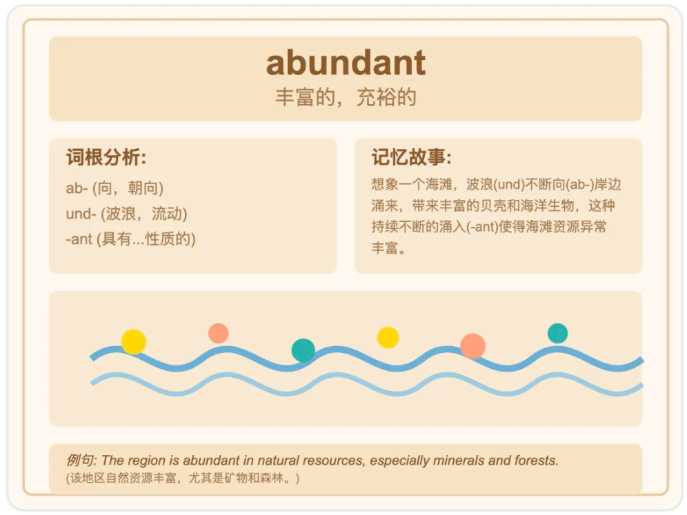 abundant想象一个海滩,波浪(und)不断向(ab-)岸边涌来,带来丰富的贝壳和海洋生物,这种持续不断的涌入(-ant)使得海滩资源异常丰富。