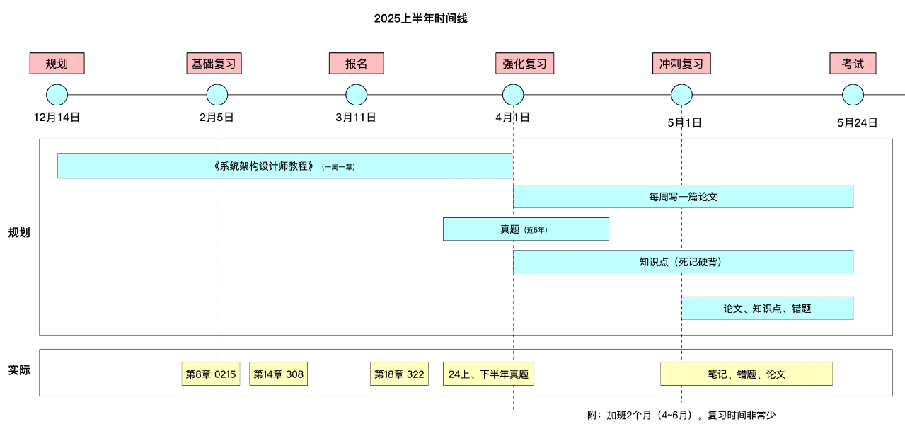 结合自身的工作经验围绕着《系统架构设计师教程第2版》和历年真题(近5年,软考达人小程序)制定了如下复习计划: