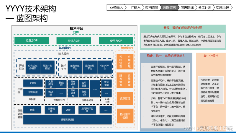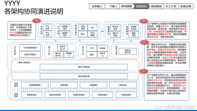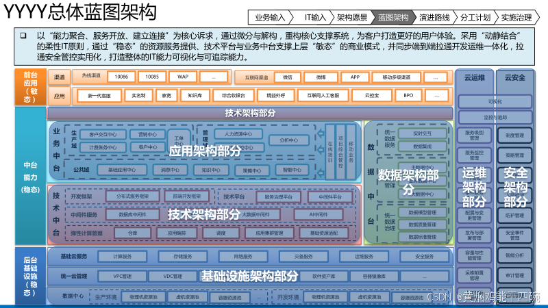 技术架构为整个4A架构提供底层的技术支撑。它涉及硬件选型、软件部署、网络安全保障以及开发运维流程等多个方面,确保系统的稳定运行。此外,技术架构还需关注新技术的引入和应用,以提升系统的性能和效率,为数字化转型提供坚实的技术保障。