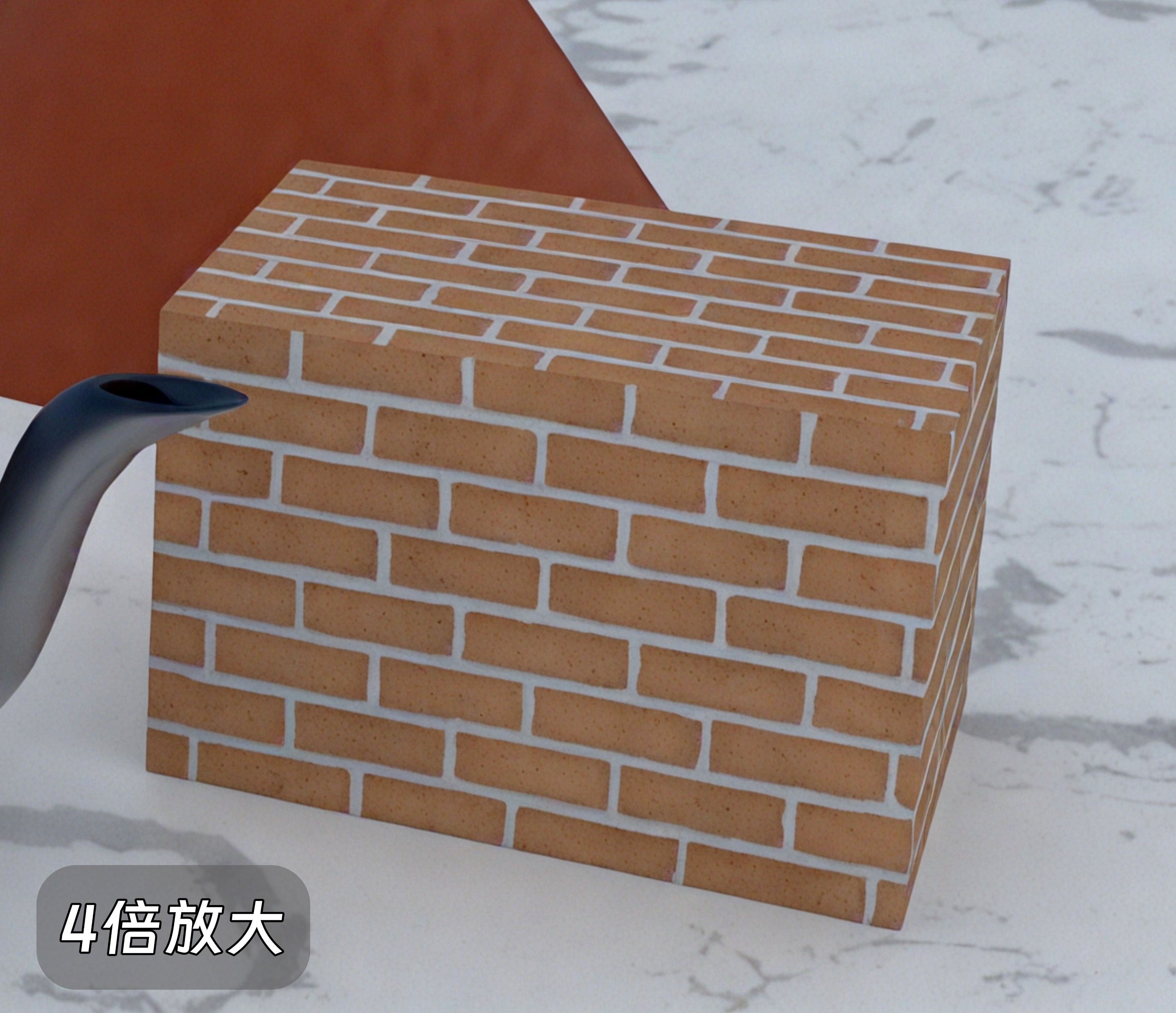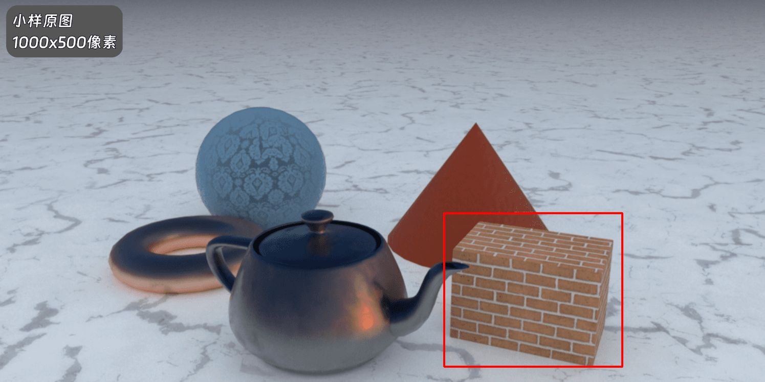 以1000x500像素的茶壶小样图为基础,聚焦红砖立方体,对比未放大与 2 - 4 倍放大效果。瑞云AI 超分技术低分辨率图像经技术处理,实现无损高清化,让砖块纹理、缝隙等细节在放大后愈发清晰。