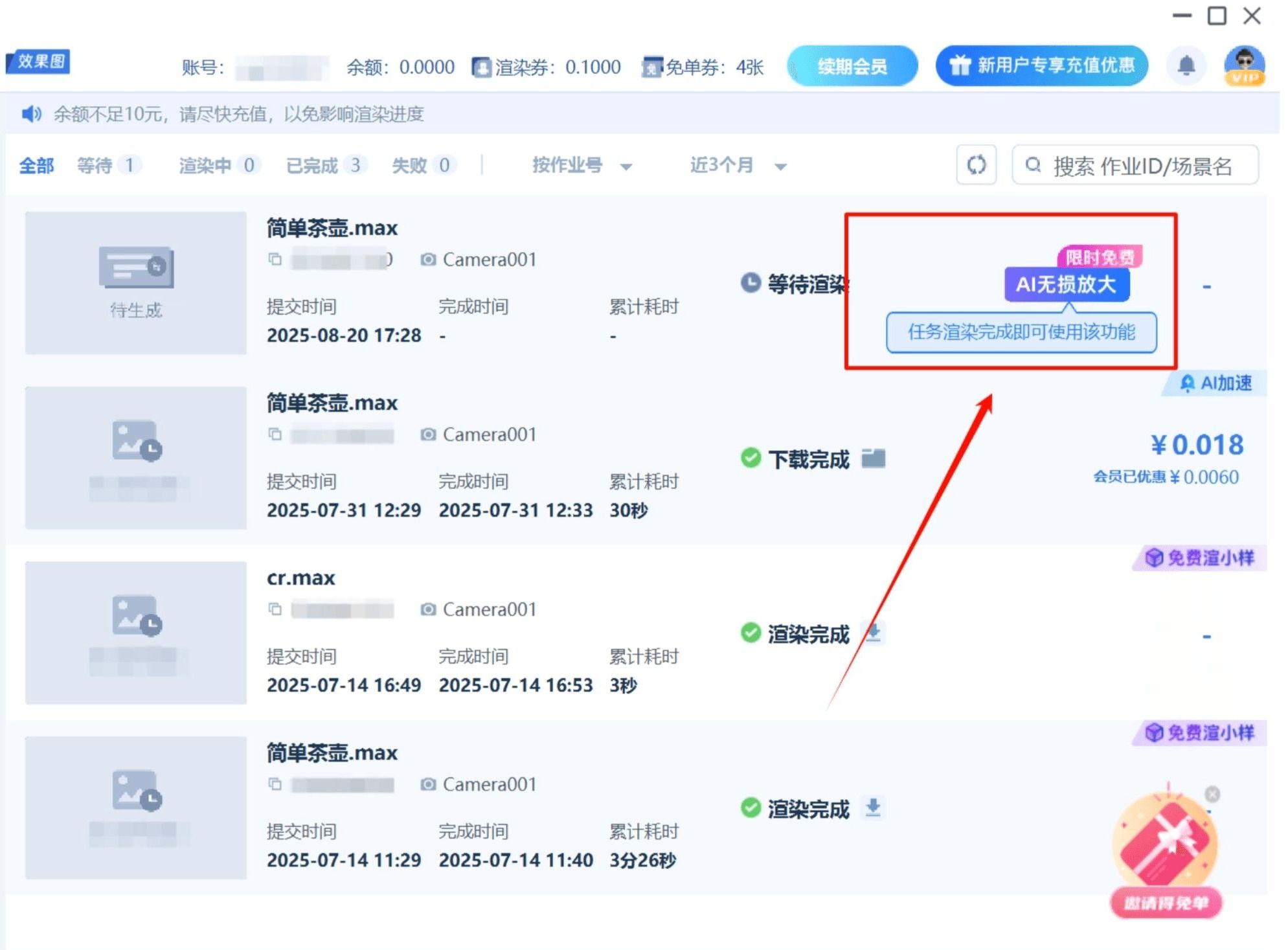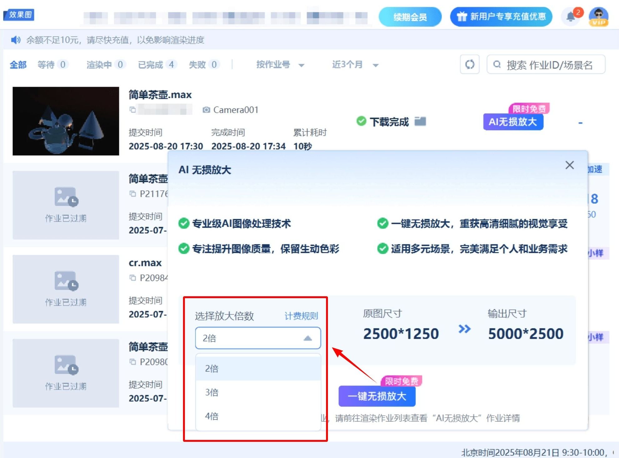 在实际应用中,该技术已成熟落地于瑞云效果图云渲染领域:用户可在瑞云渲图客户端中先通过「免费渲小样」功能快速生成低分辨率小样图,再点击「AI 无损放大」功能,免费将图像分辨率从 1000×500 无损提升至2000×1000(2 倍放大)、3000×1500(3 倍放大)乃至 4000×2000(4 倍放大)。