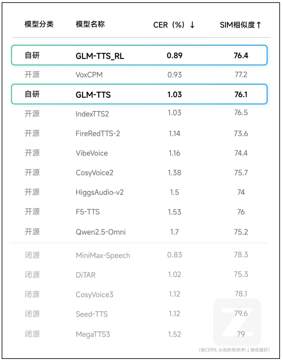 GLM-TTS_RL以0.89%的极低字错误率(CER)超越CosyVoice2等主流模型,成功刷新开源 SOTA 记录
