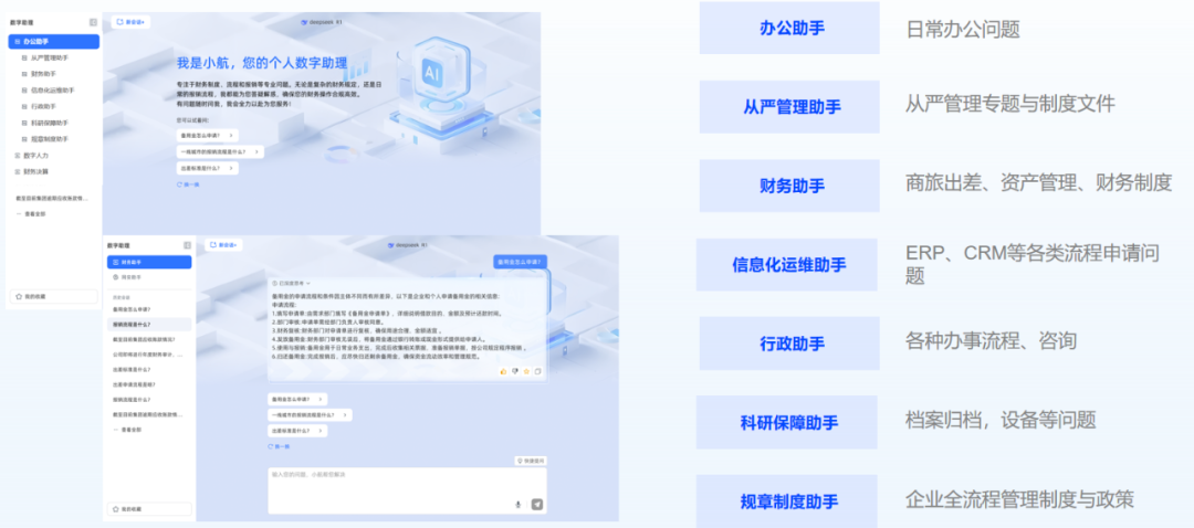 整合企业制度、业务流程、技术文档等知识,构建 “财务助手”“合规助手” 等智能体,支持 “出差报销标准”“某合同法律风险” 等问题秒级响应。某保险企业应用后,员工咨询效率提升 50%,知识传承成本降低40%。