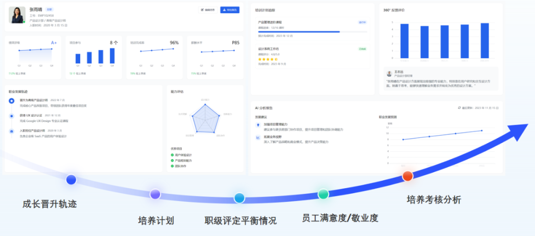 通过整合员工绩效、项目、培训等多维度数据,AI 自动构建 “成长晋升轨迹”“能力评估”“培养计划” 等画像。例如,某制造企业通过智能画像发现 “某工程师项目参与度高但培训完成率低”,针对性制定 “技术进阶 + 管理培训” 计划,3 个月内其晋升为项目负责人,团队效率提升 20%。