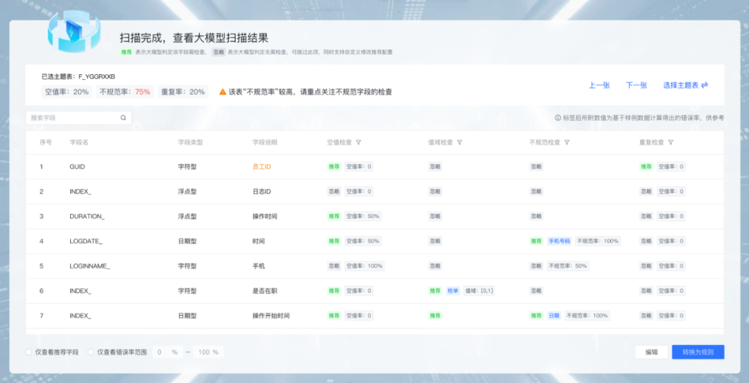 智能质检与资产盘点:大模型自动识别数据空值、重复、值域异常等问题,生成质量规则;同时结合敏感数据分级分类,自动构建资产目录,实现 “一键盘点”。