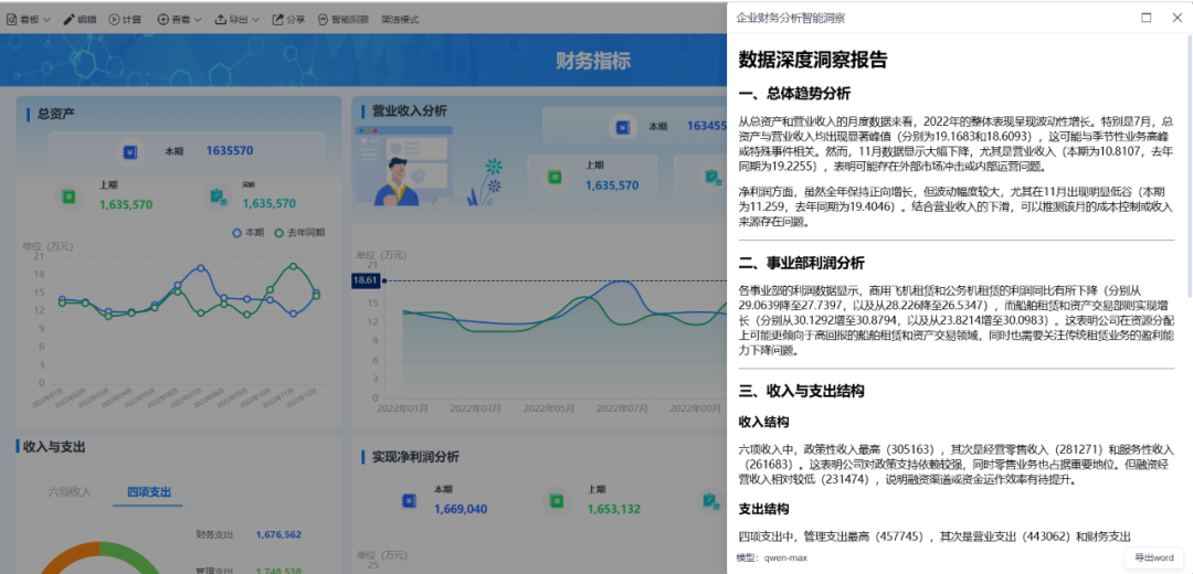 依托历史数据与算法模型,实时监控业务异常(如预算超支、理赔率突增),并生成预警提示与整改建议。某金融租赁企业应用后,预算审批 “盲批” 风险降低 60%,重大决策失误率下降 35%。