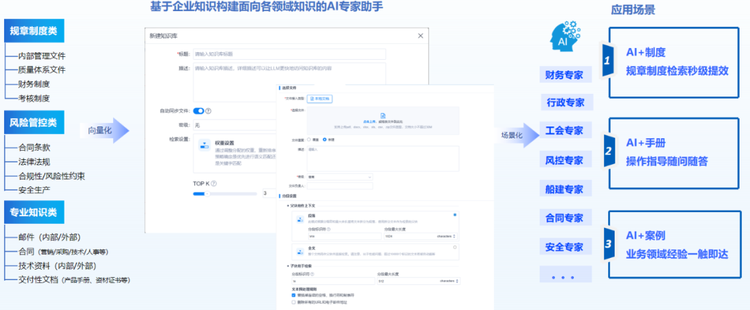 私域知识百问百答:整合企业制度、合同、技术文档等碎片化知识,构建 “财务专家”“合规专家”“产品专家” 等智能助手,支持 “备用金申请流程”“某合同条款风险” 等问题秒级响应。