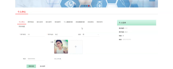 个人中心:在个人中心页面可以对个人中心、修改密码、医生咨询、医生预约、取消预约、个人健康档案、家庭健康档案、体检报告、我的发布、我的收藏进行详细操作;如图5-5所示: