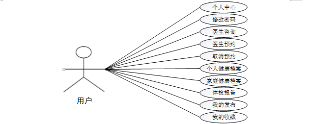 (3)、用户关键功能包含个人中心、修改密码、医生咨询、医生预约、取消预约、个人健康档案、家庭健康档案、体检报告、我的发布、我的收藏等进行管理。用户用例如下: