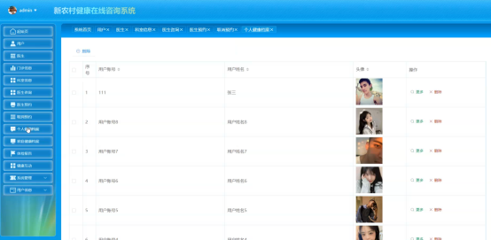 管理员进入主页面,主要功能包括用户、医生、门诊信息、科室信息、医生咨询、医生预约、取消预约、个人健康档案、家庭健康档案、体检报告、健康互动、系统管理、用户信息等进行操作。管理员主页面如图5-7所示:
