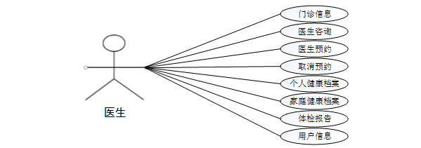 (2)、医生关键功能包含门诊信息、医生咨询、医生预约、取消预约、个人健康档案、家庭健康档案、体检报告、用户信息等进行管理。医生用例如下: