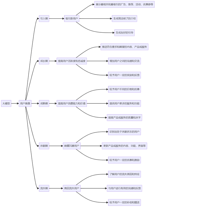 下图是一个简化的示意图,展示了基于大模型的用户生命周期管理策略的特点: