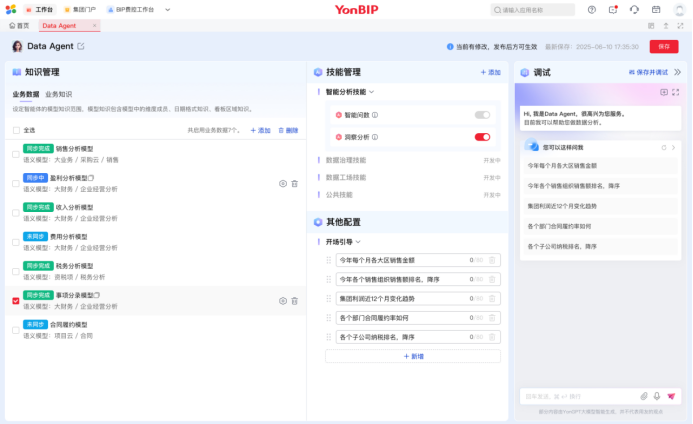 YonData – 数据平台:致力于为企业提供一个集数据整合、处理、治理和可视化于一体的数据底座。以支持HTAP场景、向量化、库内批流一体的企业级超融合数据库为高性能引擎,涵盖数据开发、指标平台、数据治理、智能分析、数据智能体等服务能力,支持企业数据从采集到治理再到分析可视化的端到端生命周期管理。基于大模型能力,帮助企业快速构建场景化数据智能体,提供问数、洞察分析的技能,快速选择分析模型、配置业务知识,根据知识自动生成开场引导。
