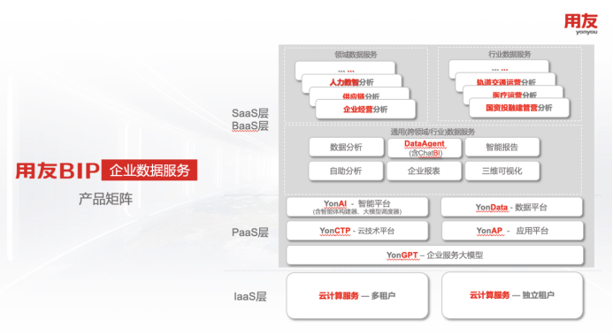 用友BIP企业数据服务产品矩阵涵盖了从IaaS层、PaaS层以及上层的SaaS与BaaS服务,各层级协同为企业提供 “从基础设施到场景应用”的全方位数据服务。