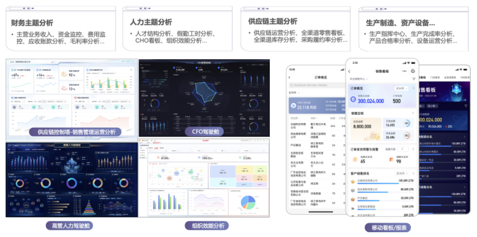 领域层面,包括:财务领域的司库决策分析、运营分析、税务分析等;人力领域的CHO管理驾驶舱、人才结构分析、假勤工时分析、薪酬成本分析、组织效能分析、数智全景仓等;供应链领域的供应链运营中心、客户运营看板、销售履约看板、业绩达成分析等;生产领域的生产指挥中心、生产管控看板、车间管控看板、质量分析等;营销领域的客户经营分析、新零售分析、全渠道销售与回款分析;采购领域的供应商360画像、寻源主题看板、采购履约分析、采购分析报表等;资产领域的资产管理与经营分析、设备维修维护分析等。