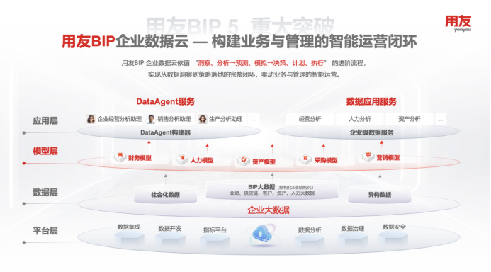 数据层:经过治理的数据汇聚到数据层,覆盖了用友BIP大数据、异构系统数据及社会化数据,形成高质量的“企业大数据”资产。