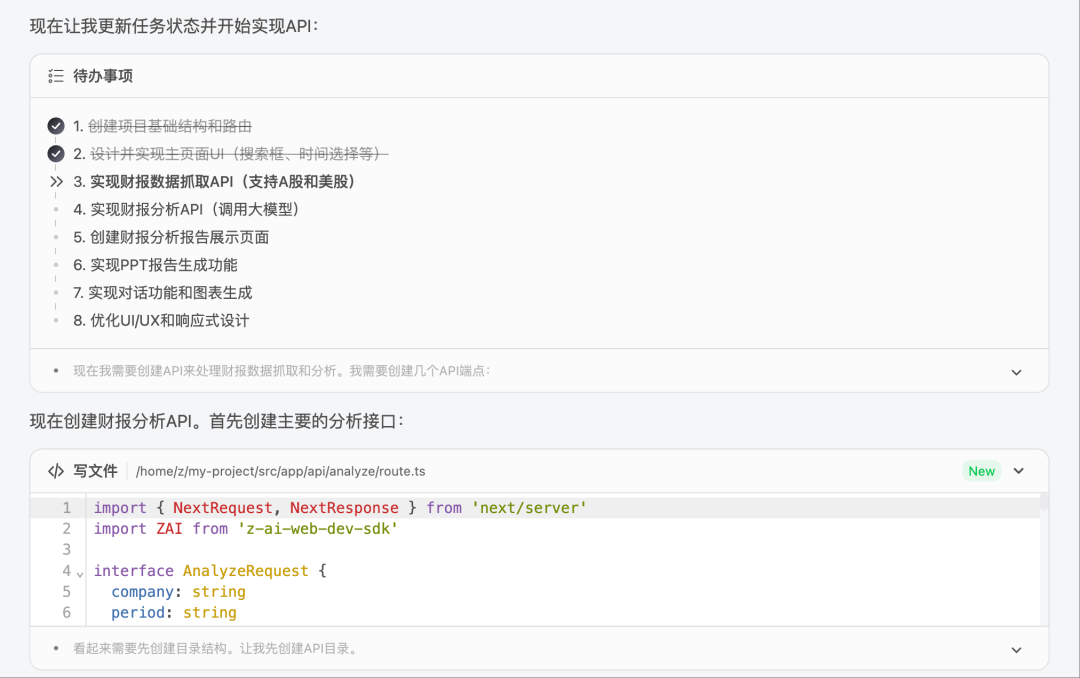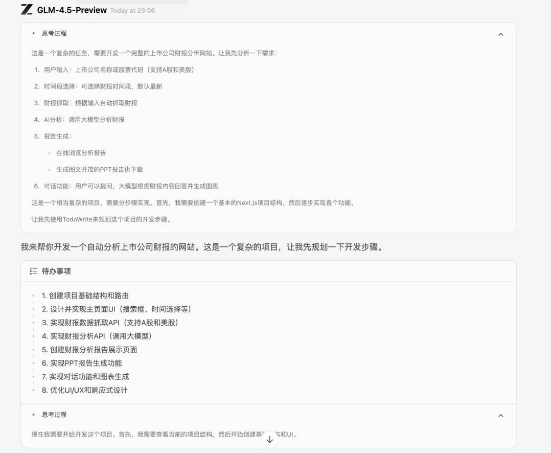 然后GLM-4.5开始了它的思考和动作,创建了一个基本的Next.js项目结构,并使用TodoWrite来规划整个项目的开发步骤:
