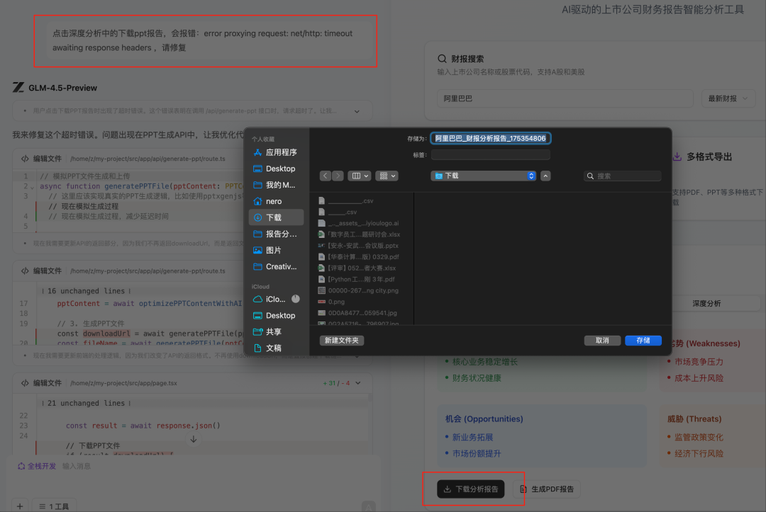后边在点击深度分析中的下载报告按钮会报错,小编直接左侧交互框告诉他错误信息:error proxying request: net/http: timeout awaiting response headers ,请修复。等待1分钟左右,功能顺利修复完成。