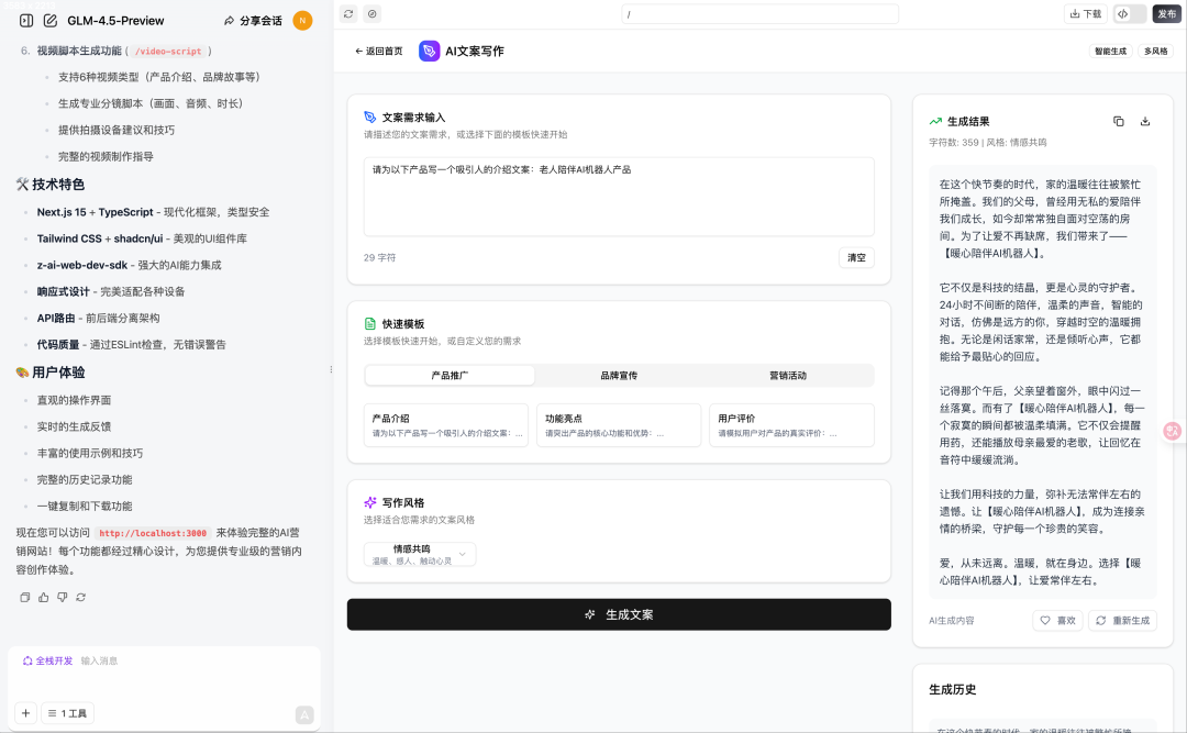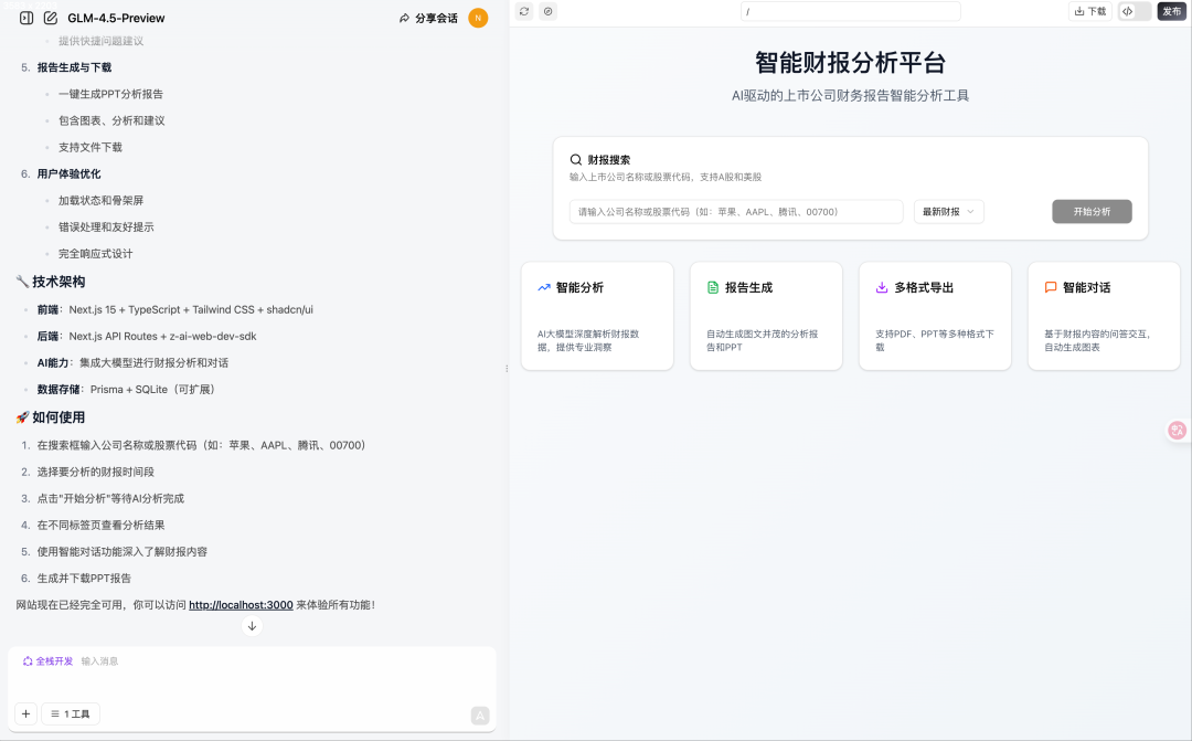 最终整个项目完成之后,GLM-4.5会在服务器端命令行启动项目,整个窗口会分成左右两大窗口,左侧是与大模型交互以及动态输出日志交互信息,右侧就是实际运行起来的网站预览。如果对生成的功能或者UI不满意,或者运行过程有出现错误问题,可以随时在左侧交互框中告诉它,非常方便和易用!
