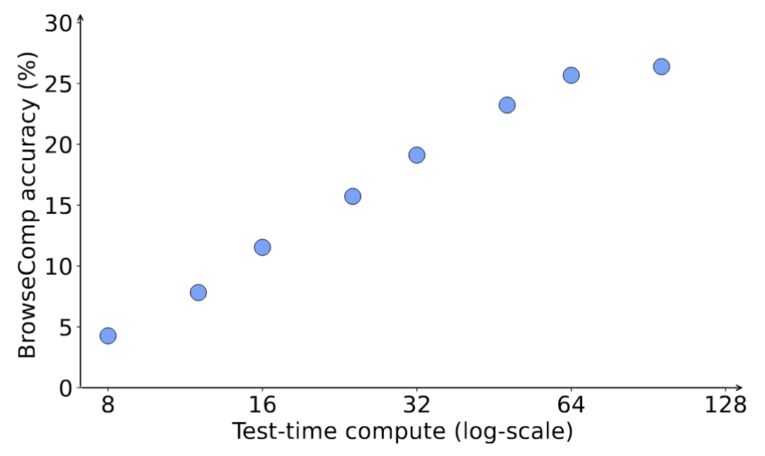 下图显示了 GLM-4.5 在 BrowseComp 上的测试时扩展精度。