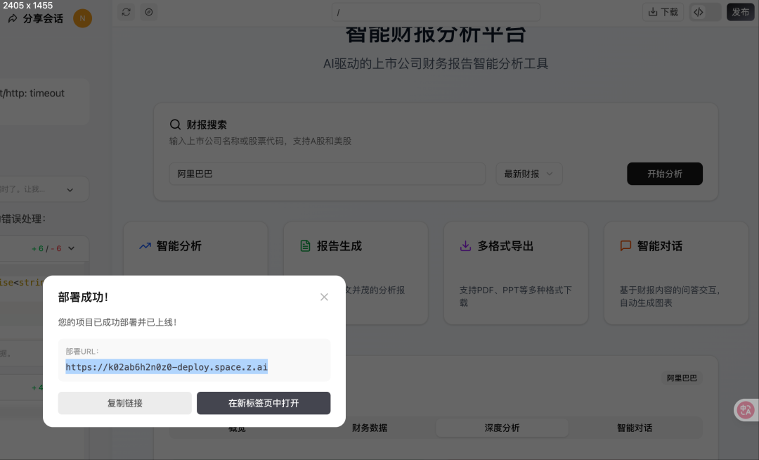 一次运行成功!输入阿里巴巴,直接把财报分析内容展示了出来!