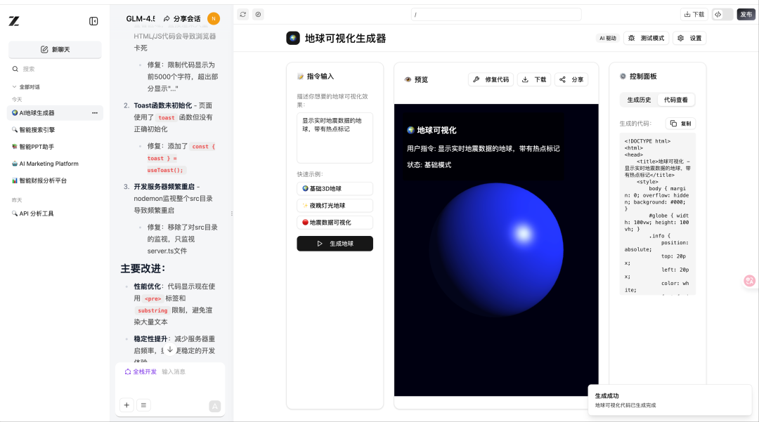 GLM-4.5不仅擅长处理复杂代码,同时也具有优秀的数据精准处理、交互动画设计能力。以下是GLM-4.5制作的一个3D 交互式地球网页,用户可以点击地点查看详情,并伴有平滑的缩放动画。
