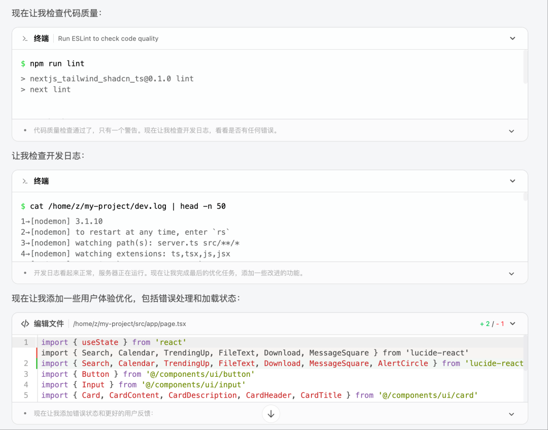 最后完成整个代码构建后,它还会回顾并检查整体的代码质量,检查开发日志,并且做一些用户体验优化,代码开发这么细心负责,这让人类开发者情何以堪...